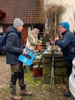 Nach dem steilen Aufstieg über den Schluppwald wurden wir schon von Gitta, Mäx und Waldemar mit heißen und kalten Getränken, Kaffee und Kuchen aber auch Würstchen erwartet.