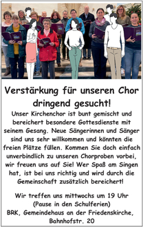 | 10.30 Uhr | Gottesdienst in der Friedenskirche, anschließend Kirchenkaffee im Gemeindehaus |