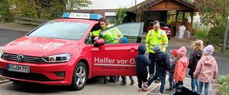 Am Ende durften die Kinder das HVO-Fahrzeug erkunden und sehen, wie hell das Blaulicht leuchtet und wie laut das Martinshorn ist. Das hat ihnen richtig Spaß gemacht!