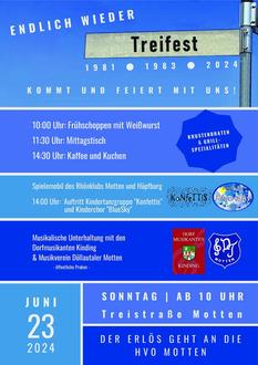 Die Einwohner der Treistraße laden nach 41 Jahren zum 3. Treifest nach Motten in die Treistraße ein. Nach 1981 und 1983 wird es dieses Jahr wieder das legendäre Straßenfest „In der Trei“ geben.