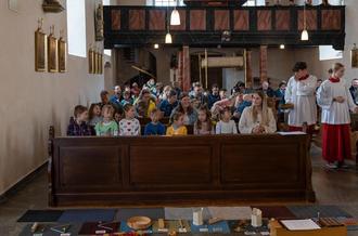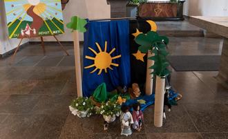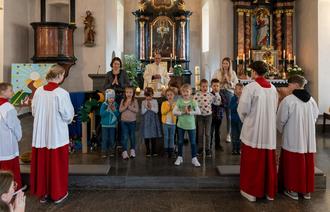 Am 05.Mai begann unser Kindergartenfest mit einem Familiengottesdienst mit Herrn Pfarrer Thurn. Das Thema „Schöpfung“ hatten die Erzieherinnen mit den Kindern ausführlich mit Büchern, Liedern, Spielen und kreativen Basteleinheiten erarbeitet und vorbereitet. Viele Eltern durften ebenfalls durch die Ohrwürmer der Kinder daran im Vorfeld teilhaben. Die intensive Vorbereitung fand sich im gelungenen Gottesdienst nicht nur in Liedern und Tanz, sondern auch in einer Klanggeschichte wieder.