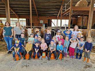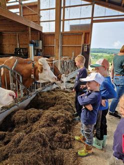 Nachdem sich alle bei einem gemütlichen Picknick gestärkt hatten, erwartete die Kinder auf dem Hof spannende Führung: Sie durften Milchkühe aus nächster Nähe beobachten, Kälbchen streicheln und erfuhren, wie eine moderne Melkanlage funktioniert.