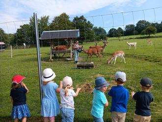 Nachdem Frühstück ist Ramona ins Gehege des Rot- und Damwilds gegangen und hat diese gefüttert, dabei schauten wir gespannt und neugierig zu, vor allem wie der große Hirsch Namens Easy ganz nah von ihr gefressen hat. Auch die Hirschkuh ist mit ihrem Namen Helga in unserem Gedächtnis geblieben, sodass die Kinder bei den weiteren Besuchen sie schon von weitem gerufen haben. Direkt neben unserem Picknick grasten die Alpakas mit den Namen Roxy, Bärbel und Rosalie. Um diese besser bei unserem Frühstück beobachten zu konnten, setzten sich einige Kinder so hin, dass sie sie betrachten konnten. Es war schön zu sehen, was für eine Freude die Kinder bei dem Besuch auf der Schlupp Berg-Farm hatten.