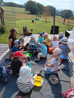 An drei wunderschönen Vormittagen haben die Krippenkinder der Strolchengruppe mit Alpakas, Dam – und Rotwild bei der Schlupp-Berg Farm gefrühstückt.