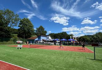 Am Sonntag, dem 7. Juli, wurden wir mit einem blau-weißen Himmel begrüßt, der zahlreiche Besucher anlockte. Den musikalischen Auftakt des Tages machten "Die Weißenbacher Musikanten", die mit ihrer Blasmusik für eine festliche Atmosphäre beim Frühschoppen sorgte. Bei herrlichem Sonnenschein und ausgezeichneter Stimmung feierten wir die Eröffnung unserer neuen Tennisplätze. Zu den Ehrengästen gehörten die stellvertretende Landrätin Frau Meyer-Dirks und die 2. Bürgermeisterin Lena Böhm, die herzliche Grußworte an die Besucher richteten.