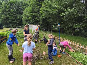 Im Juli haben wir sehr viel im Garten gemacht. Dank der guten Erde, dem vielen Regen und den Helfern beim Gießen ist unser Gemüse sehr gut gewachsen. Wir haben auch wieder den Garten dekoriert. Die Kinder haben mit alten Backsteinen ein Insektenhotel im Blühstreifen errichtet. Die Ohrschlitzer- Hotels haben auch ihren Platz gefunden und wurden aufgestellt. Am Eingang haben wir eine neue Infotafel aufgebaut, die wir bald gestalten werden. Ein Umtrunk mit Zitronenmelisse- Eistee aus unserem Garten war natürlich auch noch drin.