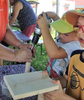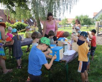 Am 17. August konnte der Gartenbauverein 18 Kinder auf dem öffentlichen Spielplatz neben dem Kindergarten begrüßen, um mit ihnen Nisthilfen/Vogelhäuschen zu bauen.