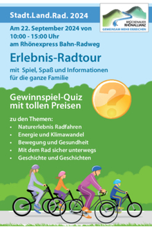 Am 22. September 2024 findet von 10 bis 15 Uhr im Rahmen des Aktionstags "Stadt.Land.Rad" eine Erlebnis-Fahrradtour entlang des Rhön-Express Bahnradweges statt. Dieser besondere Tag zielt darauf ab, das Bewusstsein für Energie und Klimawandel zu fördern und gleichzeitig Bewegung, Gesundheit und Sicherheit auf dem Fahrrad zu thematisieren. Die Veranstaltung bietet Spiel, Spaß und Informationen für die ganze Familie und die Möglichkeit, die schöne Natur des Sinntals auf dem Rad bewusst zu erleben.