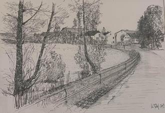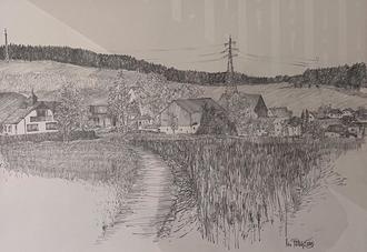 Udo Rödel spart Unschönes nicht aus: Strommasten durchschneiden die dörfliche Idylle von Traindorf. Bleistiftzeichnung von 2001.