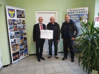 Der Erlös in Höhe von 237,00 Euro wurde auf 500,00 Euro aufgestockt. Im Rahmen eines Besuches am 07.02.2024 haben Niederlassungsleiter Roland Lochner und Mitarbeiter Mario Ott den Spendenscheck für einen gemeinnützigen Zweck an Bürgermeister Franz Uome übergeben.