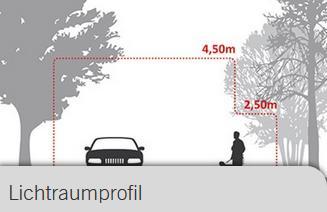 In diesem Zusammenhang wollen wir Sie auch über das freizuhaltende sogenannte „Lichtraumprofil“ über Geh- und Radwegen sowie Fahrbahnen informieren: Als „Lichtraumprofil“ wird eine definierte Umgrenzungslinie bezeichnet, die meist für die senkrechte Querebene eines Fahrweges bestimmt wird. Aus Gründen der Sicherheit und Leichtigkeit des Verkehrs muss das Lichtraumprofil der öffentlichen Verkehrsflächen frei und sauber gehalten werden. Es beträgt im Gehwegbereich 2,50 m und im Fahrbahnbereich 4,50 m.