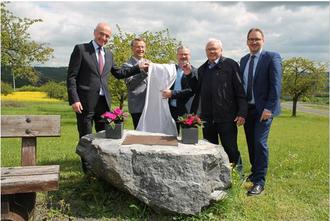 Im Zentrum der Zusammenkunft am Gedenkstein in der Altensteiner Flur stand die Enthüllung der Tafel, die folgende Inschrift aufweist: „Flurneuordnung Altenstein mit Neuverteilung im Jahr 2006“. Von links nach rechts: → Landrat Wilhelm Schneider, Reiner Väth, die beiden Ansprechpartner Andreas Binger und Hubert Angermüller sowie Bürgermeister Wolfram Thein.