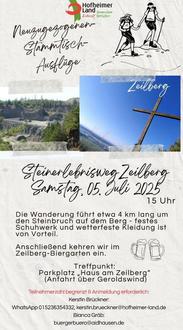 Am Samstag, 5. Juli ist eine Wanderung auf dem Steinerlebnisweg Zeilberg geplant. Die Strecke führt etwa 4 km um den Steinbruch - festes Schuhwerk und wetterfeste Kleidung ist von Vorteil.
