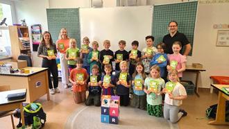 „Guten Morgen Herr Bürgermeister“ tönte es am 16. Juli aus dem Klassenzimmer der 3c. Bürgermeister Wolfram Thein besuchte gemeinsam mit Maren Lorenzen-Fischer und Felix Henneberger von der Baunach-Allianz die Grundschule in Maroldsweisach. Im Gepäck hatten sie Möhrchenhefte – das besondere Hausaufgabenheft, dass die Baunach-Allianz seit 2022 an die Grundschulen der Mitgliedskommunen verteilt.
