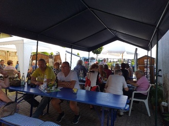 Bei kostenlosem Kaffee und Kuchen ist gleich eine gute Stimmung gewesen. Natürlich gab es auch noch anderes Essen (Brotzeiten und Wiener) und eine große Auswahl an kalten Getränken. Bedanken für ihr kommen möchten wir uns beim Kreisvorstand Herrn Winfried Golonka mit Frau, bei unseren beiden Musikanten, die ständig für gute Laune gesorgt haben, beim Aufbauteam und allen Helfern in der Küche und drum herum. Ganz besonderen Dank an alle Besucher unseres Festes und Frau Barthelmann, die uns ihren Hof, Zelte, Bänke, Tische und liebevolle Deko zur Verfügung gestellt hat.