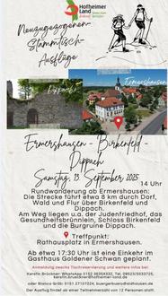 Am Samstag, 13. September findet eine Rundwanderung ab Ermershausen statt. Die Strecke führt etwa 8 km durch Dorf, Wald und Flur über Birkenfeld und Dippach. Am Weg liegen u.a. der Judenfriedhof, das Gesundheitsbrünnlein, Schloss Birkenfeld und Burgruine Dippach.