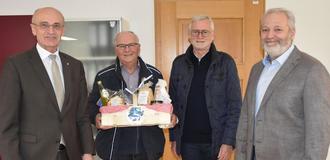 Landrat Wilhelm Schneider (links) bei der Verabschiedung des bisherigen Regionalbeauftragten Walter Klein (2. von links) bzw. Einführung des Nachfolgers Hubert Zinkl, zusammen mit Wirtschaftsförderer Michael Brehm (rechts).