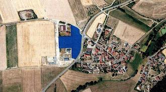 Das blaue Feld zeigt die Fläche der geplanten Solaranlage, gegenüber der Ortschaft Allertshausen.