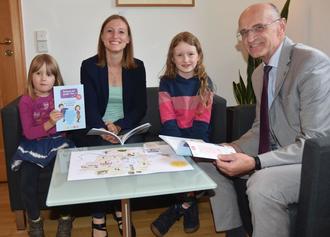 Die fünfjährige Noemi (links) und die 8-jährige Alva freuen sich über das neue Landkreisbuch und zeigen Landrat Wilhelm Schneider und Regionalmanagerin Sonja Gerstenkorn, welche Stationen sie als erstes besuchen wollen.
