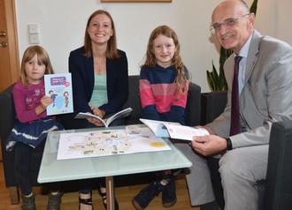 Die fünfjährige Noemi (links) und die 8-jährige Alva freuen sich über das neue Landkreisbuch und zeigen Landrat Wilhelm Schneider und Regionalmanagerin Sonja Gerstenkorn, welche Stationen sie als erstes besuchen wollen. Foto: Moni Göhr/Landratsamt Haßberge.