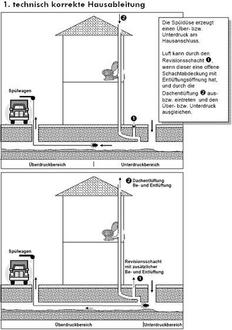 Sind die sanitären Anlagen fachgerecht ausgeführt und in einem ordnungsgemäßen Zustand, ist hier der Druckausgleich durch den Revisionsschacht (Kontrollschacht auf dem Grundstück) und durch die Dachentlüftung gewährleistet. Der verbleibende restliche Druck kann durch angeschlossene Lüftungsleitungen der Hausinstallationen entweichen.