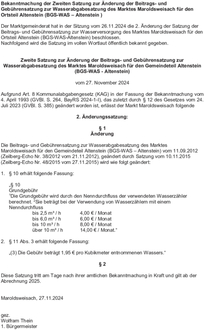 Der Marktgemeinderat hat in der Sitzung vom 26.11.2024 die 2. Änderung der Satzung der Beitrags- und Gebührensatzung zur Wasserversorgung des Marktes Maroldsweisach für den Ortsteil Altenstein (BGS-WAS-Altenstein) beschlossen.