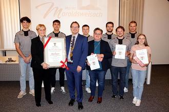 Eine Würdigung ihrer Leistungen konnten Johannes Bätz, Samuel Schäff, Jonathan Schneider, Maximilian Freß, Benjamin Fuchs und Jonas Steinrichter in Empfang nehmen. „Eine Mannschaft zeigt immer einen guten Teamgeist, wenn es zu solchen Erfolgen kommt“, sagte der Bürgermeister und wünschte allen weiterhin sportlichen Erfolg. Marion Reichhold, Inhaberin der Zimmerei Klaus Treiber in Hafenpreppach, ist seit 2023 die erste Zimmerer-Obermeisterin in Bayern. „Die Position einer Obermeisterin ist nicht nur eine berufliche Verantwortung, sondern auch Zeugnis für außerordentliches Können, Engagement und Führungstalent, was du auf besondere und in beeindruckender Weise vereinst“, so Bürgermeister Thein. Bereits in jungen Jahren habe sie sich großen Herausforderungen stellen müssen, da ihr Vater früh verstarb. Aufgrund besonderer Leistung konnte sie schon mit 22 Jahren ihre Meisterprüfung ablegen. „Auch damals, warst du die jüngste Zimmerer-Meisterin in ganz Bayern“, so Thein. Ehrungen sollen nicht nur eine Würdigung für Vergangenes sein, sondern auch eine Ermutigung für die Zukunft.