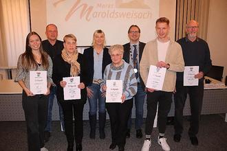 Foto: Helmut Will Geehrte und Ehrende (von links): Clara Jakob (Ditterswind), 3. Bürgermeister Dieter Hepp, Petra Kimmel (Maroldsweisach), 2. Bürgermeisterin Heidi Müller-Gärtner, Liselotte Fertinger (Ditterswind), 1. Bürgermeister Wolfram Thein, Adrian Büschel (Maroldsweisach) und Berthold Steinert (Dippach). Foto: Helmut Will