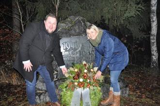 Foto: Martin Schweiger Heldburgs Bürgermeister Christopher Other und Maroldsweisachs Zweite Bürgermeisterin Heidi Müller-Gärtner legten einen Kranz vor dem Gedenkstein nieder.