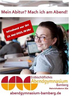Abitur? Als einziges Gymnasium des zweiten Bildungsweges in Oberfranken ermöglicht das Erzbischöfliche Abendgymnasium in Bamberg den Erwerb der allgemeinen Hochschulreife (Abitur) im Abendunterricht. Am 22.05.2023 informiert die Schule (Heinrichsdamm 32 a, Bamberg) ab 18 Uhr über ihr spezielles Bildungsangebot. Weitere Informationen finden Sie auf unserer Homepage www.abendgymnasium-bamberg.de oder nehmen Sie unverbindlich Kontakt über E-Mail auf: sekretariat@abendgymnasium-bamberg.de