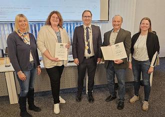 Melanie Gräbner und Gunther Hartleb wurden für langjährigen kommunalen Dienst geehrt. Das Foto von links: 2. Bürgermeisterin Heidi Müller-Gärtner, Melanie Gräbner, Bürgermeister Wolfram Thein, Gunther Hartleb und 3. Bürgermeisterin Ramona Schrapel.