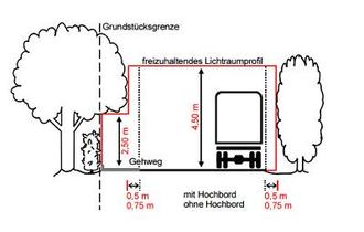 Über dem Gehweg muss ein Freiraum von 2,5 Meter und über der Fahrbahn ein Freiraum von 4,5 Meter gemessen von der Straßenkante frei sein.