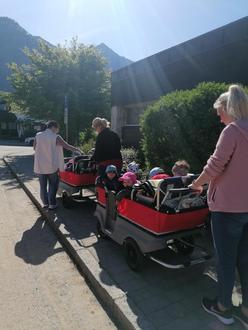 Unsere Krippenkinder sind mit dem neuen Krippenwagen viel unterwegs auf Entdeckungstour und genießen die ersten warmen Frühlingssonnenstrahlen.