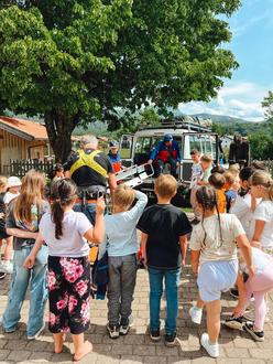 An der offenen Ganztagsschule (OGTS) Gundschule Unterwössen erklärten Ende Mai drei Bergwacht-Einsatzkräfte zusammen mit den Betreuerinnen 25 Kindern die Tätigkeit der Bergwacht. Die Bergwacht stellte das Bergrettungsfahrzeug und das medizinische Equipment vor (Bild). Die sechs- bis zehnjährigen Kinder arbeiteten engagiert bei der „Versorgung von Verletzten“ mit Schaufeltrage, Vakuumbett und Bergesack mit. Mit großer Ausdauer wurden immer wieder „Verletzungen“ an Hand, Arm und Beinen „versorgt“.
