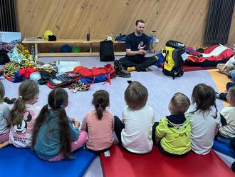 Erstmals präsentierte sich die Bergwacht Grassau im Haus für Kinder am Gänsbach, dem neuen Kindergarten in Grassau. Die beiden aktiven Einsatzkräfte Dominik Hartmann und Josef Grießenböck erklärten zunächst, was bei der Vorbereitung auf eine Bergtour alles zu beachten ist und wie man sich ausrüsten muss. Neben festem Schuhwerk und Wechselkleidung sind dies insbesondere ausreichend Verpflegung, ein Verbandspäckchen und natürlich ein Mobiltelefon, um im Notfall über die einheitliche Notrufnummer „112“ Hilfe rufen zu können. Ergänzend erklärten sie dann die zusätzliche Ausrüstung der Bergwacht wie Bergesack, Medizinrucksack, Schienungsmaterial und Sicherungsequipment.