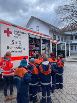 Anfang April besuchten die Nachwuchskräfte das Bayerische Rote Kreuz in Grassau. Genauer gesagt die Bereitschaft Achental, die ehrenamtlichen Mitglieder kommen neben Sanitätsdiensten bei Veranstaltungen vor allem bei Großschadenslagen zum Einsatz. So konnte neben dem klassischen Rettungswagen auch der GW-San besichtigt werden. Dieser ist für die Behandlung von 25 verletzten oder erkrankten Personen ausgelegt und verfügt über eine dementsprechend umfangreiche Beladung. Zum Einsatz kam dieser beispielsweise beim Unwetterereignis am Chiemsee Summer 2017, wo mehrere Tausend Menschen in Sicherheit gebracht werden mussten. Nach dem Kennenlernen der vier Fahrzeuge der BRK Bereitschaft Achental folgte noch eine Besichtigung der Rettungswache. Von dort rücken rund um die Uhr die hauptamtlichen Mitarbeiter des Rettungsdienstes aus.