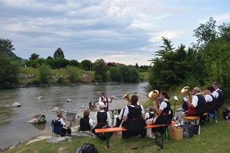 Eine besondere Location hatte sich die Musikkapelle Marquartstein für ihr Standkonzert ausgesucht, ganz romantisch am Ufersaum der Ache. Auch auf der gegenüberliegenden Seite hatten sich Zuhörer niedergelassen, sie wurden mit Ansagen und winken ins Geschehen einbezogen.