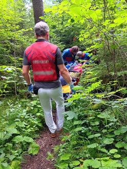 Am Montag, 07.07.2025 musste die Bergwacht Grassau einem 72-jährigen Wanderer aus München zu Hilfe kommen. Er war alleine über die Fahrstraße von Marquartstein in Richtung Staffn-Alm gegangen, als er in einem Steig auf etwa 700 Metern Meereshöhe gestürzt und ein kleines Stück abgerutscht war und sich dabei eine Oberschenkelverletzung zugezogen hatte. Im Ruhezustand waren die Schmerzen erträglich, unter Belastung waren sie jedoch für einen eigenständigen Abstieg zu groß, weshalb er gegen 12:25 Uhr einen Notruf absetzte.