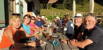 wenn auch manche auf die Aufforderung des Fotografen „lachen“ eher gequält reagierten oder gleich ganz wegschauten. Wir trafen uns bzw. marschierten in kleinen Gruppen auf die Brachtalm. Wetter ausgezeichnet, Verpflegung ebenso, Stimmung super. Ein schöner Ausklang einer sehr durchwachsenen Sommerwandersaison. Jetzt freuen wir uns auf die hoffentlich stabilere Herbstwandersaison.