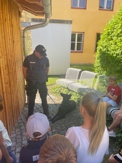 Die Kinder lernten die Reiterstaffel und ihre Pferde kennen. Die beiden Polizeireiter erklärten den Umgang mit den Tieren, die Aufgaben der Reiterstaffel im Einsatzgeschehen und ließen die Kinder gespannt hinter die Kulissen blicken. Auch ein Diensthund fehlte nicht. Ein Diensthundeführer zeigte seinen treuen Begleiter, erklärte die Ausbildung und die verschiedenen Aufgaben, bei denen die Hunde der Diensthundestaffel eingesetzt werden und zeigte bei einer Suchübung wie geschickt und schnell der „verlorene Gegenstand“ gefunden wurde.