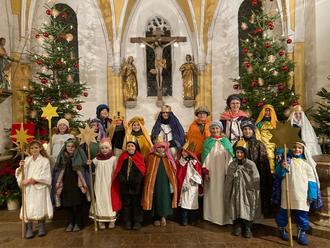 Nach einem schönen Aussendungsgottesdienst machten sich die Kinder in fünf Gruppen jeweils mit erwachsener Begleitung auf den Weg und zogen trotz der Kälte und dem Schnee unter den Schuhen von Haus zu Haus. Mit ihren einstudierten Liedern und Sprüchen begeisterten sie die Hausbewohner, die sich über den Besuch freuten. In diesem Jahr waren sogar einige Kindergartenkinder mit dabei, die ausharrten und den Segen brachten. Mit der geweihten Kreide wurde der Segen an den Türen angebracht. Die 22 Sternsinger selbst waren beseelt von ihrer Mission.