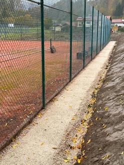 Ein 80 cm breiter Streifen aus Staffenkies soll die Moos- und Unkrautbildung auf den Tennisplätzen verhindern.
