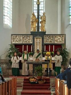 Währenddessen liefen vor der Kirche Vorbereitungen zum gemeinsamen Mittagessen. Außerdem bot die Diakonie wunderschöne Herbstdekorationen gegen Spende an, insektenfreundliche Blühpflanzen wurden angeboten sowie selbstgemachte Honigprodukte und „Eine Welt“ -Produkte. Für die Kinder stand eine Hüpfburg bereit, sowie verschiedene Bastelangebote. Alle Anwesenden waren sich einig, dass dieses Event wiederholt werden soll.