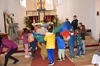 Die Kinder in der Kirche wurden dazu an den Altar gebeten, um mit einem bunten Tuch und quietschgrünen Hoffnungsbällen in Bewegung zu kommen. Die Bälle wurden mit dem bunten Tuch hochgeworfen und zu den Kirchenbesuchern, die die Bälle aufnahmen und weiterwarfen. Symbolisch sollte gezeigt werden, wie durch Bewegung auch wieder Hoffnung und Farbe ins Leben kommen kann, sich neue Perspektiven auftun und wie sich Menschen gegenseitig Hoffnung geben können. Michael Soergel rief „jammern hilft nicht, Menschen sind nicht allein, alles ist möglich“. Auch bei den Fürbitten hielten die Kinder das bunte Tuch mit den Bällen, es wurde das Lied „Caminando va“ angestimmt, bei dem dann auch alle Kirchenbesucher aufstanden, mitsangen, hüpften, tanzten und klatschen. Eine Kirche in Bewegung!