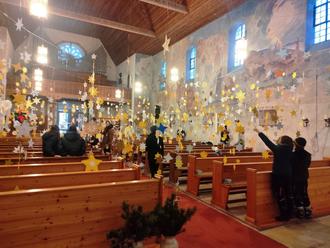 Jugendliche beim Aufhängen der Sterne oder die fertig geschmückte Pfarrkirche