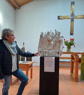 Die vergleichsweise kleine Gipsskulptur hat eine besondere Ausdruckskraft, denen sich der Betrachter kaum entziehen kann. Moni Stein gelingt es, der toten Materie der Skulpturen in ihrer Darstellung Leben einzuhauchen, verborgene Saiten im Betrachter zum Klingen zu bringen. Die Skulptur entstand vor zwei Jahren und war bereits einmal während der Fastenzeit in der Oberwössener Kirche zu sehen. Dieses Jahr wird sie während der Passionszeit in der Erlöserkirche in Marquartstein bleiben. Der sehr eindrucksvollen Figurengruppe wäre ein fester Ort in einer Kirche zu wünschen. (Giesen)