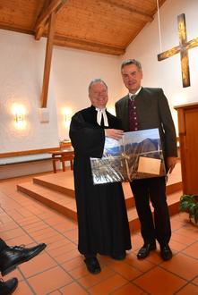 Ein Bild vom Achental übergibt Bürgermeister Andreas Scheck an Pfarrer Rainer Maier
