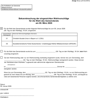 Nächster Artikel: Bekanntmachung der eingereichten Wahlvorschläge für die Wahl der ersten Bürgermeisterin oder des ersten Bürgermeisters am 08. März 2026