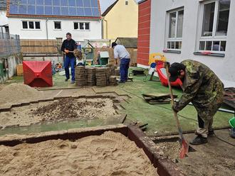 Zur Unterstützung steht ihm der gesamte Elternbeirat zur Verfügung. Seitdem wird fleißig unter Anweisung Sand und Dreck geschaufelt, Rabatten gesetzt, Pflaster ausgebaut und wieder neu verlegt, Spielgeräte zusammengeschraubt und einbetoniert. Sämtliche Arbeiten in diesem Zusammenhang werden erledigt.
