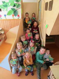 Am Donnerstag fand unsere Osterfeier statt. Wir aßen leckere Schnittlauch- und Butterbrote, Ostereier und Osterbrot. An diesem Tag besuchte uns auch der Osterhase und versteckte für jedes Kind ein kleines Nest.